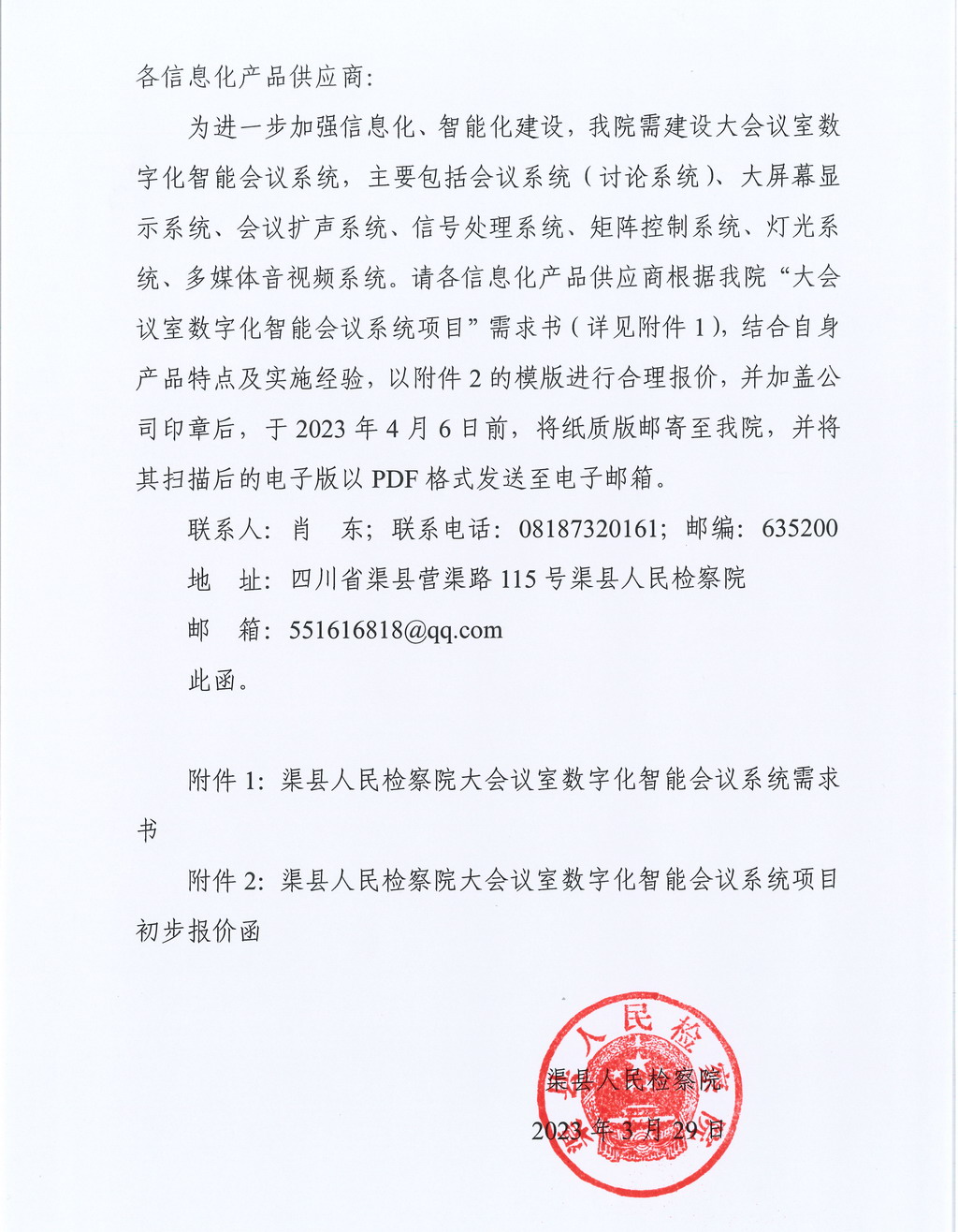 渠县人民检察院关于“大会议室数字化智能会议系统”项目初步询价函