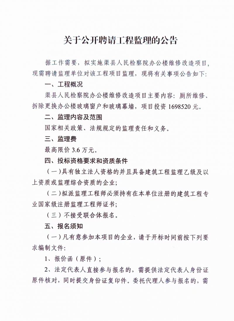 关于公开聘请工程监理的公告