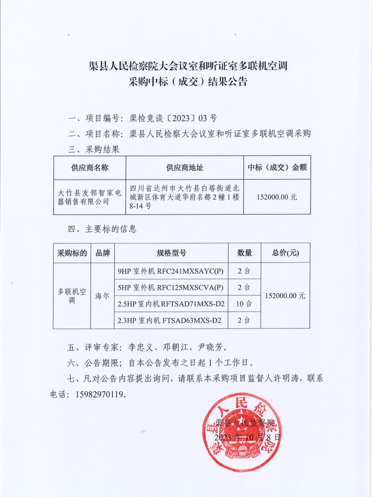 渠县人民检察院大会议室和听证室多联机空调采购中标(成交)结果公告