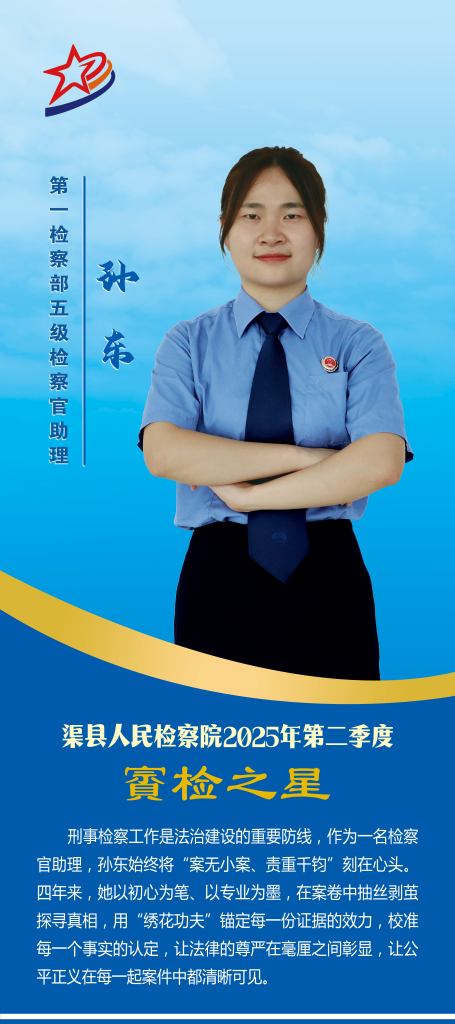 孙东,女,土家族,1995年10月29日出生,毕业于陕西理工大学法学专业,大学本科,2021年10月参加工作,现任渠县人民检察院第一检察部五级检察官助理。
