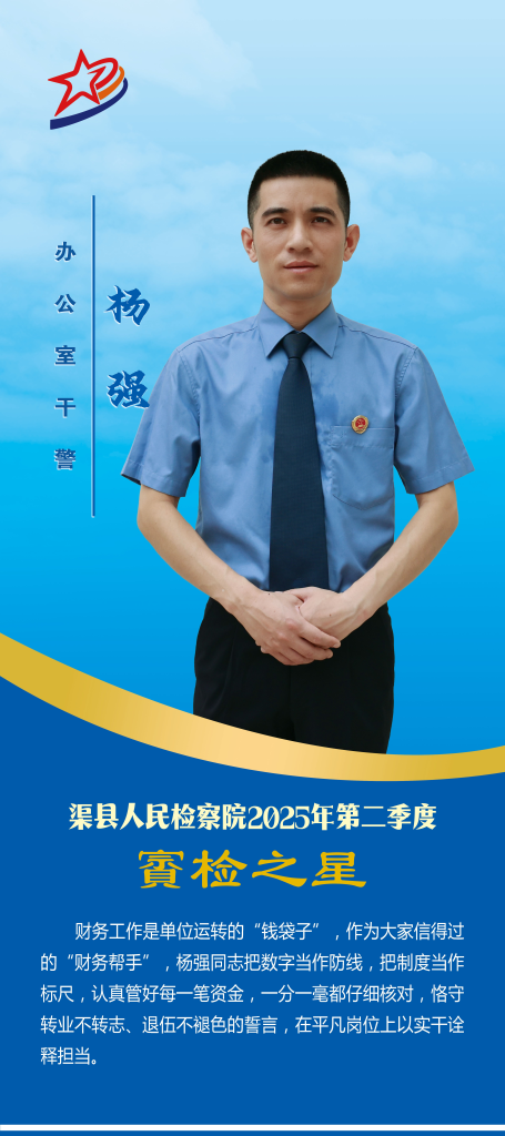 杨强同志从军装绿到检察蓝,他以“日清日结”的较真劲实现账目零差错、资金零风险。在数字与票据的平凡战场里,他把每项工作做到极致,以实干担当助推渠县检察事业在高质量发展的赛道上稳步前行。