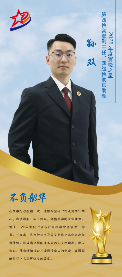 孙双,男,汉族,1994年8月生,中共党员,2017年毕业于重庆大学城市科技学院法学专业,2018年11月参加工作,现任渠县人民检察院第四检察部副主任。